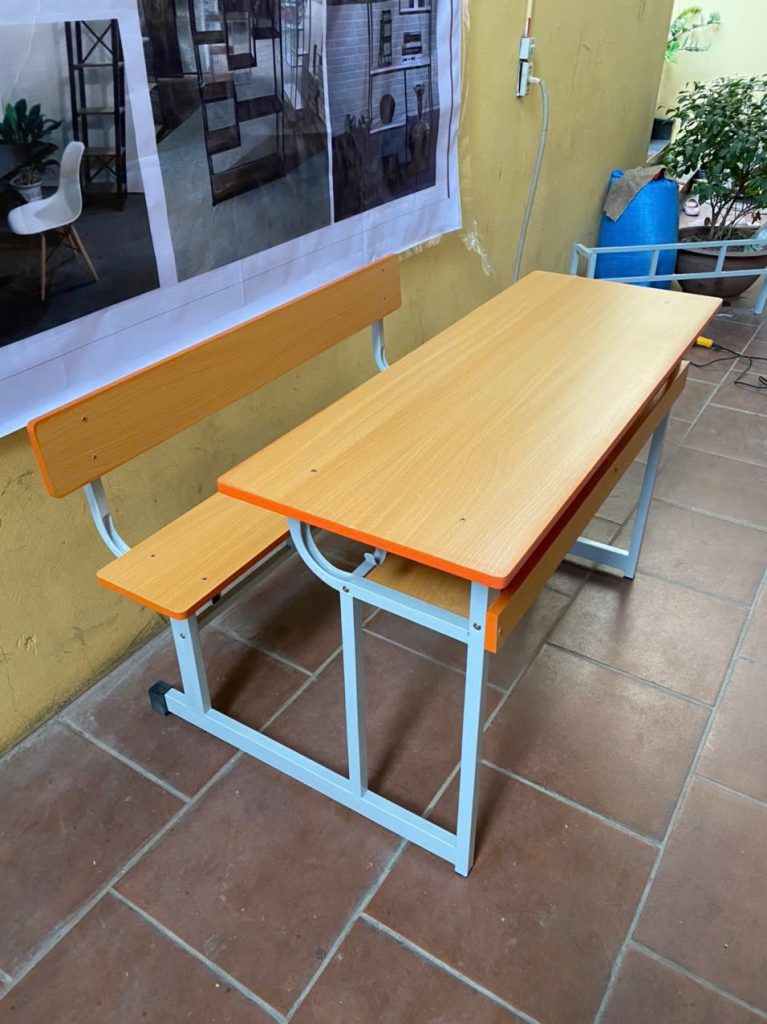 - Mặt bàn ghế học sinh tiểu học gỗ công nghiệp MDF phủ melamin chống trầy xước, không cong vênh liên kết với khung sắt bằng ốc vít.