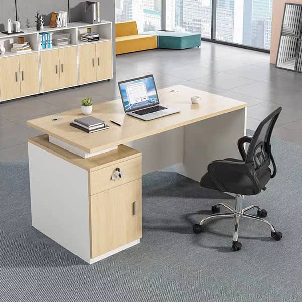 - Mặt bàn gỗ công nghiệp phủ Melamine dày 18mm chống ẩm, chống xước, chống cong vênh, mối mọt. Bền bỉ theo thời gian. Có nhiều màu sắc lựa chọn phù hợp sở thích, màu chủ đạo văn phòng.