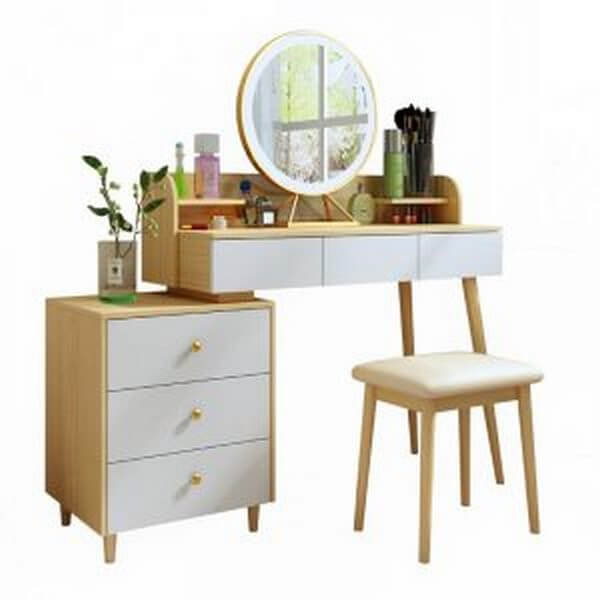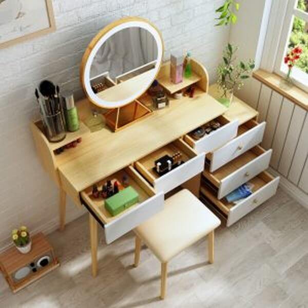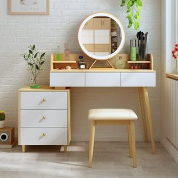 Công năng chính của sản phẩm là để sử dụng, phục vụ cho quá trình chăm sóc sắc đẹp của chị em. Phần gương bo tròn, kích thước vừa đủ để cho những hình ảnh phản chiếu chân thực và sắc nét nhất. Đặc biệt, ở viền gương có gắn đèn led với ánh sáng trắng dịu nhẹ. Ánh sáng của đèn led khi chiếu vào mặt lúc đứng trước gương có thể thấy rõ toàn bộ khuôn mặt, không có vùng nào bị tối, bị đổ bóng. Ngoài ra, bàn trang điểm được thiết kế những ngăn kéo nhỏ. Thiết kế này vừa tăng không gian lưu trữ phụ kiện, vừa giúp bạn sắp xếp đồ vật khoa học hơn.
